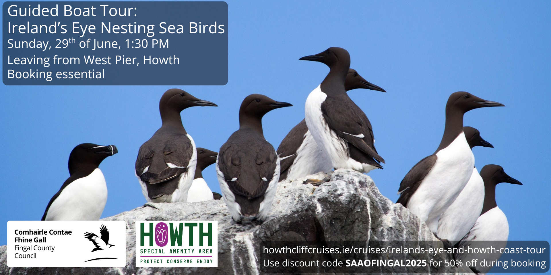 Booking required: register at https://howthcliffcruises.ie/cruises/irelands-eye-and-howth-coast-tour/ for the 29th of June at 1:30 PM and enter the code SAAOFINGAL2025 in the Promo Code box on the right during checkout for 50% off of the regular price.