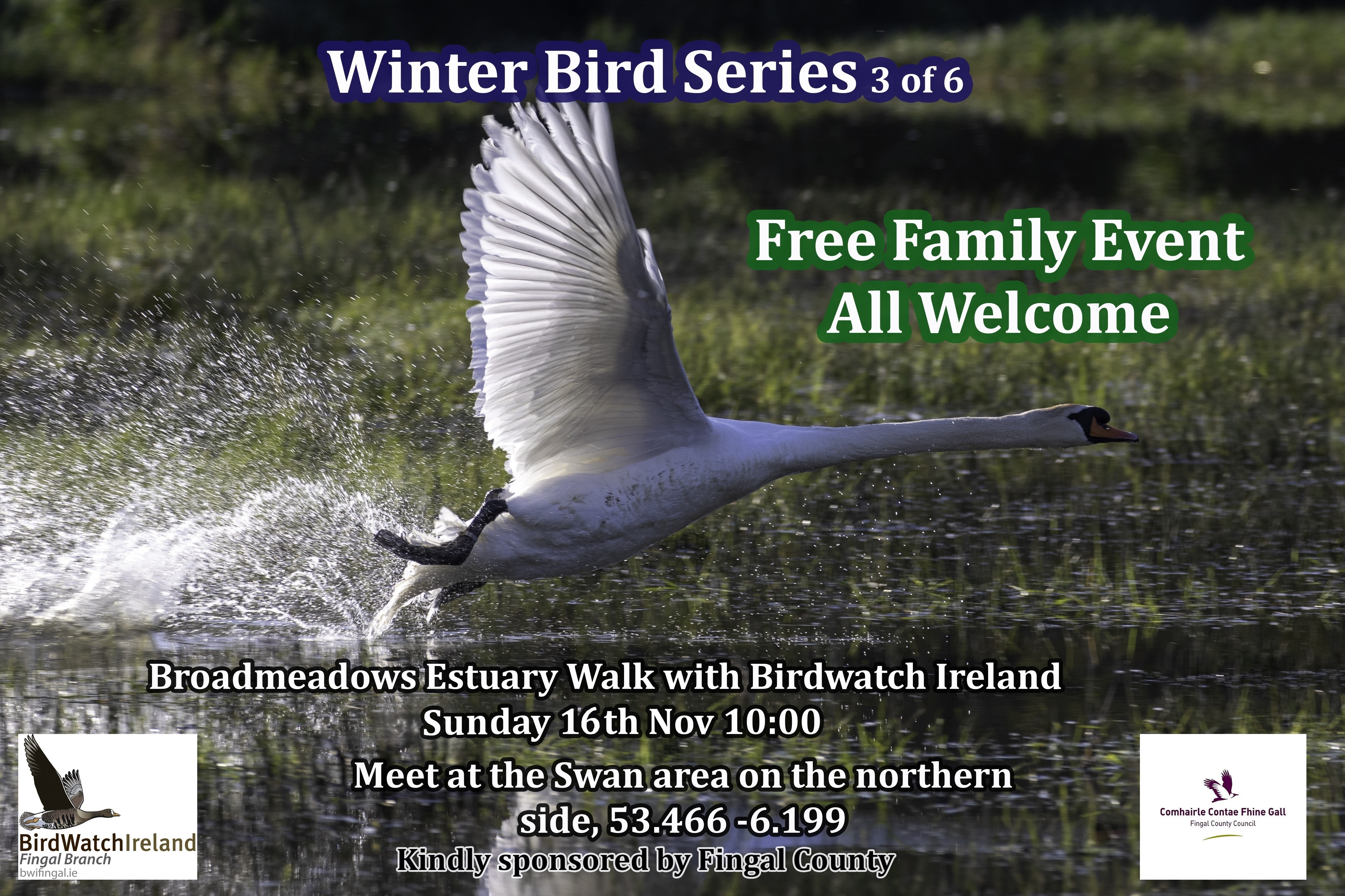 Meet at the mute swan roost area on the north shore of the estuary, along Hutchinson's Strand (coordinates: 53.466, -6.199). The event is free, requires no advance registration and is suitable for families- all are welcome, just come along.